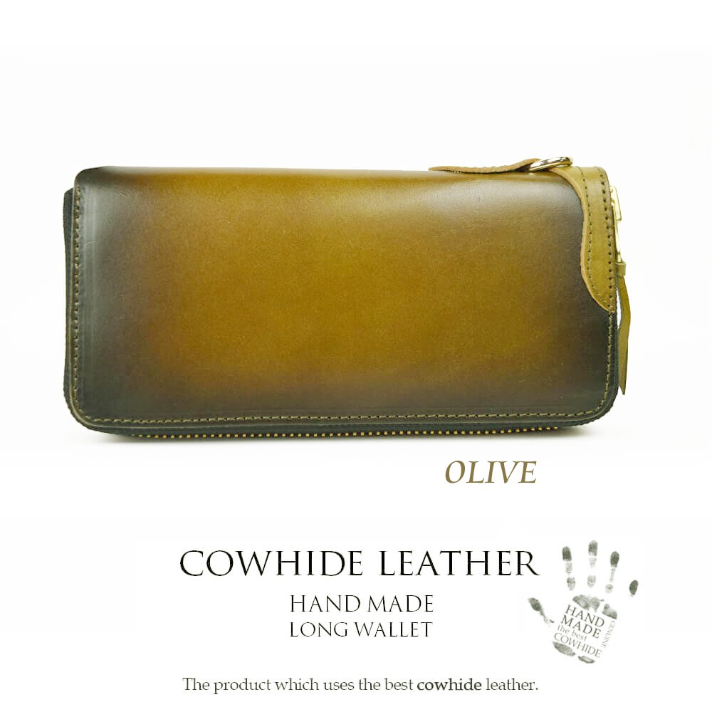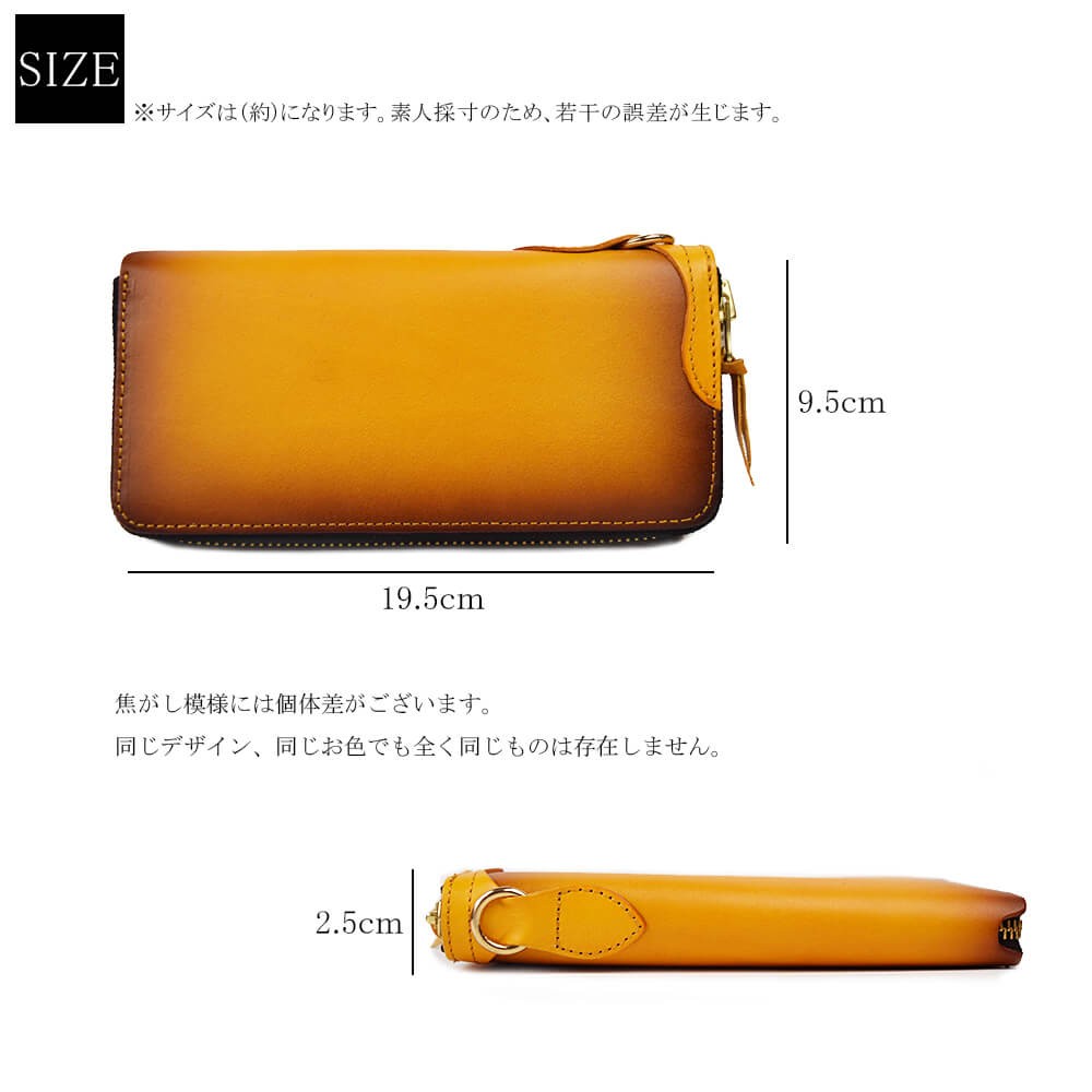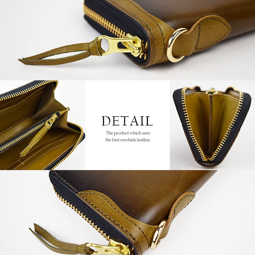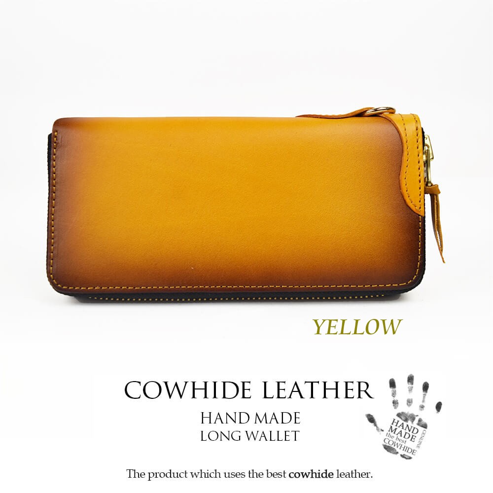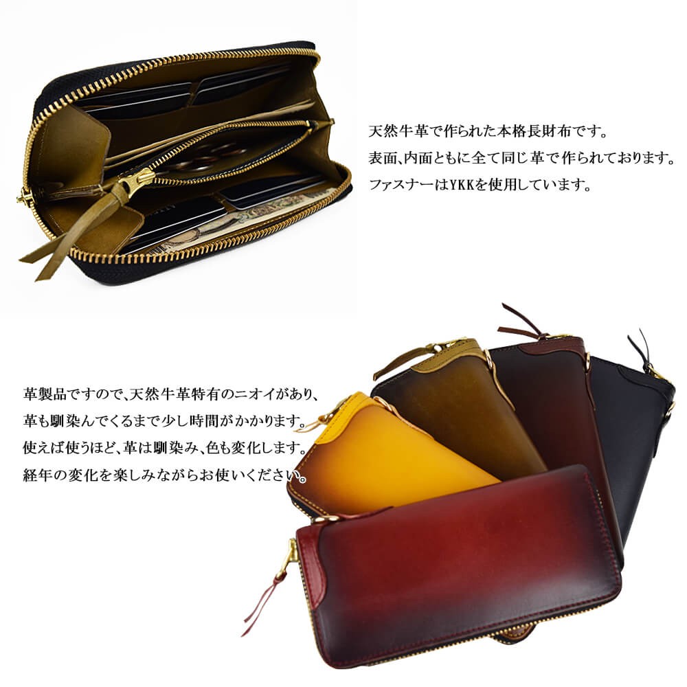 天然牛革で作られた本格長財布です。表面、内面ともに全て同じ革で作られております。ファスナーはYKKを使用。革製品ですので、天然牛革特有のニオイがあり、革も馴染んでくるまで少し時間がかかります。使えば使うほど、革は馴染み、色も変化します。経年の変化をお楽しみください。【サイズ】横幅19.5cm×高さ9.5cm×マチ2.5cm【素材】牛革、ヌメ革【仕様】お札入れ×2小銭入れ×1カードポケット×8フリーポケット×2【カラー】ブラック / ブラウン / オリーブ / イエロー / レッド
