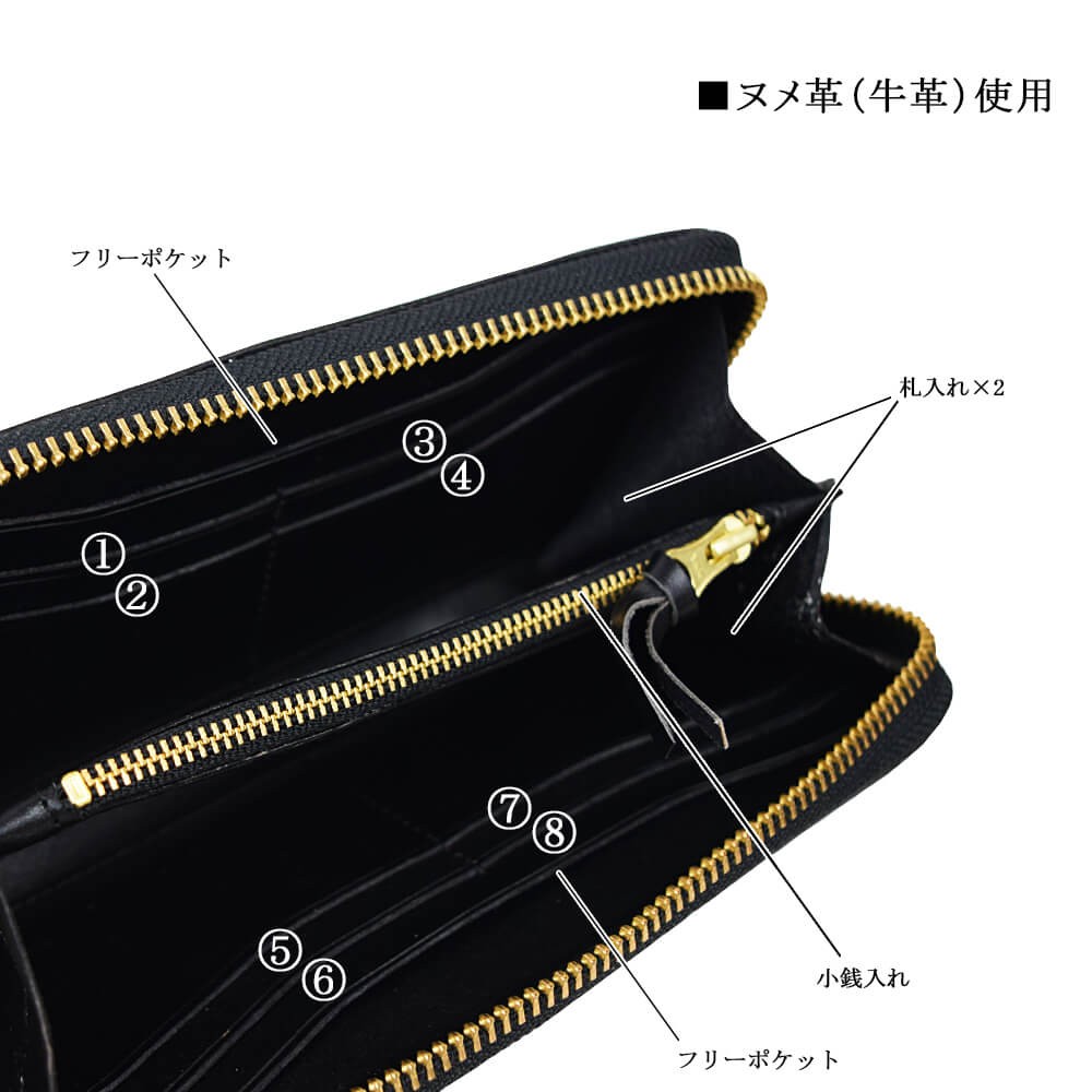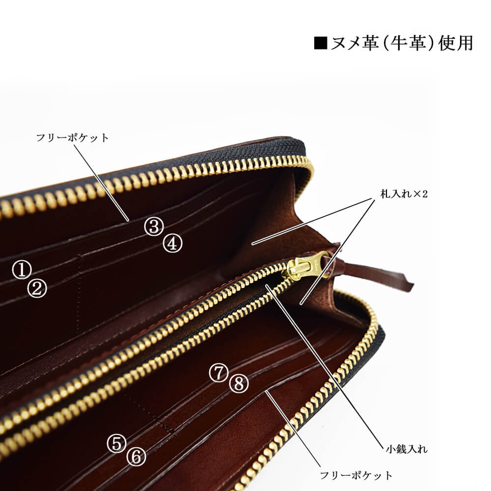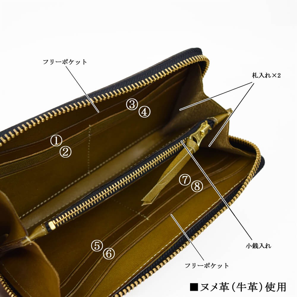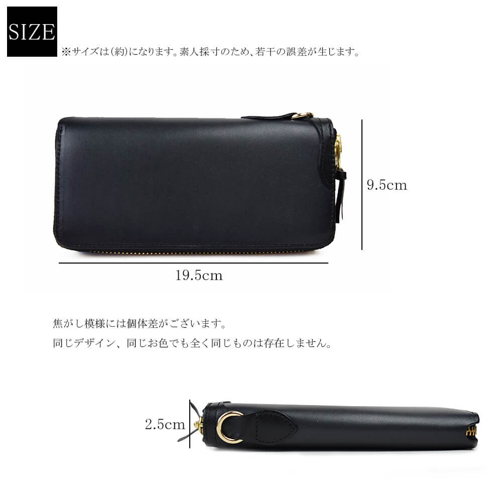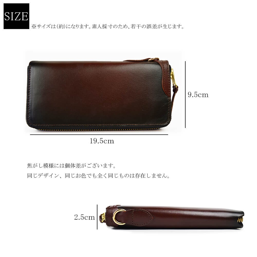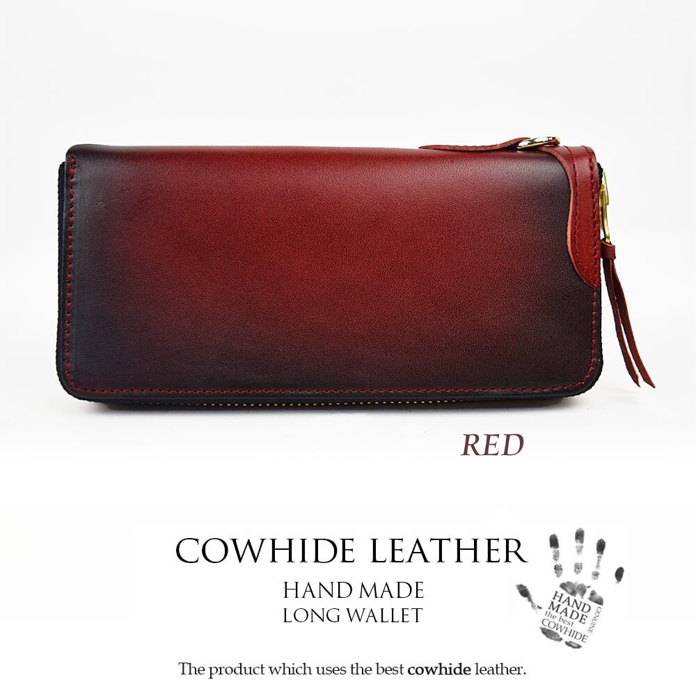 天然牛革で作られた本格長財布です。表面、内面ともに全て同じ革で作られております。ファスナーはYKKを使用。革製品ですので、天然牛革特有のニオイがあり、革も馴染んでくるまで少し時間がかかります。使えば使うほど、革は馴染み、色も変化します。経年の変化をお楽しみください。【サイズ】横幅19.5cm×高さ9.5cm×マチ2.5cm【素材】牛革、ヌメ革【仕様】お札入れ×2小銭入れ×1カードポケット×8フリーポケット×2【カラー】ブラック / ブラウン / オリーブ / イエロー / レッド