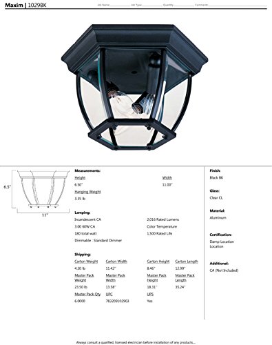 Transform your urban abode into a classical paradise with the Maxim, 1029BK, 3-Light Outdoor Ceiling Mount outdoor lighting fixtures. This designer light showcases the carton cubic feet that not just helps in deflecting the light in all directions, but also helps in uplifting the looks of the exteriors. The high-quality lights are ideal for garden area, lobby, courtyard, pedestal or a balcony. The garden light uses 120 volts of electricity supply that helps in illuminating the garden area while saving the electricity at the same time. The electric lamp is rated damp meaning it can be used under a shade in order to protect it from rain or water.