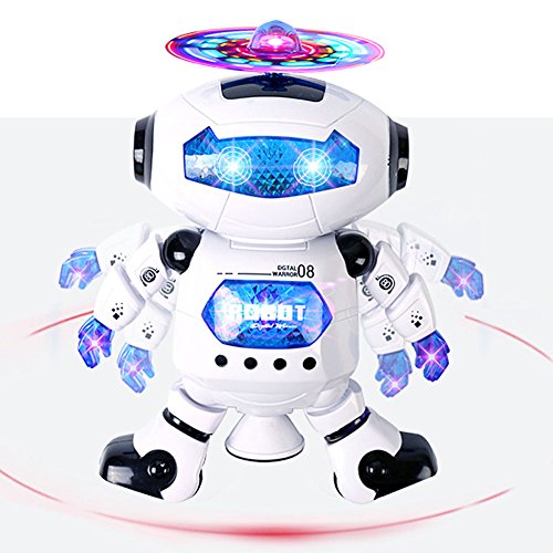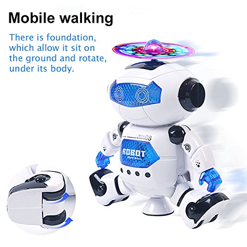 -. Feature : DANCING ROBOT TOY: Dancing action, arms and legs move with the song, 360 degree spinning action / FLASH LIGHTS DISPLAY: Constant action to entertain kids and even pets can engage, colorful lights propeller. / FOOT BALANCING ROBOT: Dual wheel foot balancing, the robot can easily navigate his surroundings / CLASSIC ROBOT TOYS: Moves and rotates with its legs and cool wheel and side steps to the beat rotates with its middle leg. Great Christmas gift to please your kids. / GUARANTEE: If you are not satisfied with our product received, you can apply for unconditional return and refund in 180 days. In terms of any problem of this product, you can send emails to us at any time. We will reply you soon.
