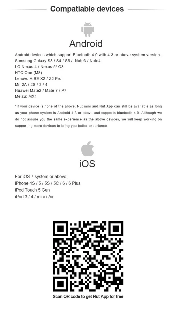 If your device is none of the above, Nut mini and Nut App can still be available as long as your phone system is Android 4.3 or above and supports bluetooth 4.0.