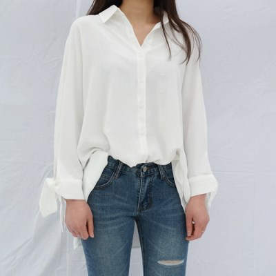 기본 베이직한 디자인이지만 소매부분에 리본디테일로 포인트를 주어 페미닌한 느낌을 더해주었어요.