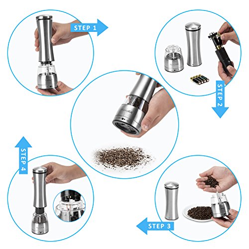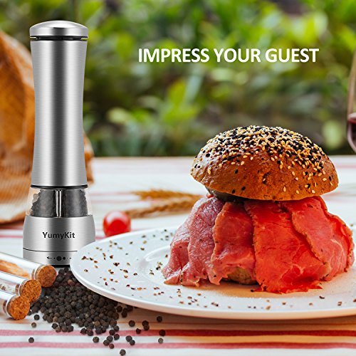 Are you already tired of manually grinding pepper or salt? Do you want a portable gadget that helps you grind spices quickly and precisely to bring out their zesty flavor? Now with the salt and pepper electric grinder by YumyKit you can always have freshly ground spices at your fingertips. ?A?Good?Helper?for?Your?Kitchen?Life These one handed electric pepper mills allow you to grind your salt and pepper with unparalleled ease. The ultimate kitchen gadget for food lovers. Easy to carry it on your bags when go for BBQ, CAMPING, PICNIC ! Unlike hand mills, these battery operated grinders, offer you an amazing results with a press of a button. Adjust the grinding coarseness just by turning the knob at the bottom, so that you can use the freshest spices in your recipes, in the size you want them to be! ?BPA- Free FDA CE Certificated The pepper grinder center body is made of BPA-free material, it also has FDA CE Certificated, this electric salt and pepper grinder ends are beautiful stainless steel, Looks great on your kitchen or dining room table. ?Portable and Durable The YumyKit electric mills are not only stylish and elegant, they are also extremely durable, because of the superior-quality stainless steel construction and professional-grade design. You can enjoy natural, flavorful and aromatic spices for years to come with this pepper and salt mill set. One-button One-hand Operation This grinder is so easy and convenient to use with just a single hand, it is designed for quick cooking, for busy moms, for elders or even for kids to use at ease. Just a push the button and enjoy the fresh, pure flavor anytime as you wish. ?What's in the box 1x Electric Salt Pepper Mill (Requires 6 AA batteries - batteries not included) 0