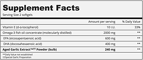 ReleaseDate : 2015-07-02 Studio : Wakunaga of America., Ltd. Publisher : Wakunaga of America., Ltd. Binding : Health and Beauty Product Description Kyolic Aged Garlic Extract EPA Cardiovascular. Description: Rich Source of Omega-3 (EPA and DHA. Helps Maintain Healthy Blood Pressure. Cardiovascular. Kyolic Aged Garlic Extract begins with 100% organically grown garlic bulbs. They are then aged to perfection in a unique extraction process to eliminate odor and create beneficial compounds found only in Kyolic. Kyolic-EPA combines Aged Garlic Extract with natural concentrated, molecular-distilled fish oil containing one of the richest and purest sources of Omega-3 essential fatty acids (EPA and DHA). This select and synergistic combination of ingredients supports healthy cholesterol levels and overall cardiovascular well-being. Take the best - Kyolic Aged Garlic Extract, the most scientifically researched, highest quality and best-selling odorless Sociable Garlic. Free Of Sodium, yeast, dairy, preservatives, sugar, gluten, artificial colors or flavors. Disclaimer These statements have not been evaluated by the FDA. These products are not intended to diagnose, treat, cure, or prevent any disease. 0