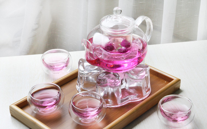 【组件】600ml花茶壶一只、心形底座一只、50ml双层品茗杯4/6只 或 90ml直身杯4/6只