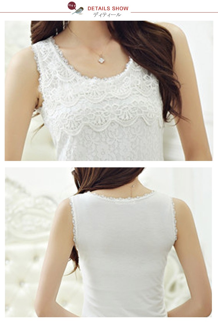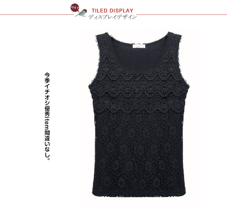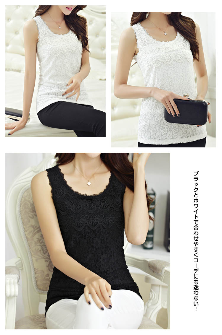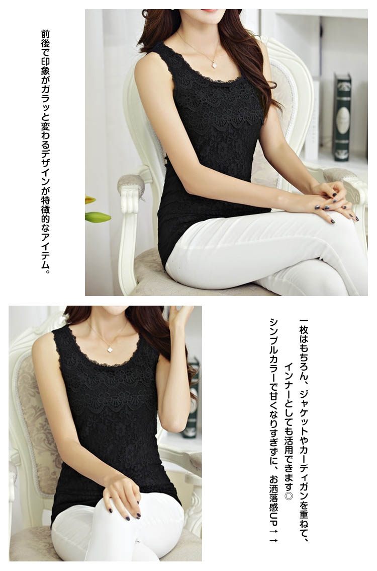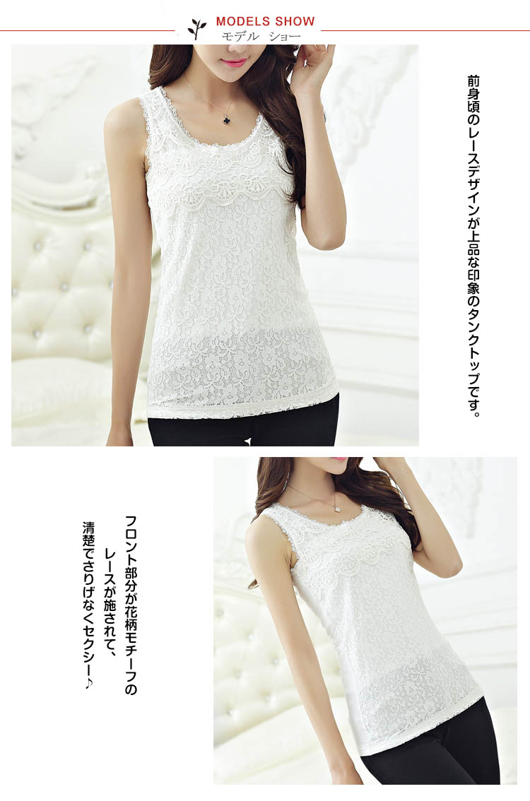 | 前身頃のレースデザインが上品な印象のタンクトップです。フロント部分が花柄モチーフのレースが施されて、清楚でさりげなくセクシー♪ブラックとホワイトで合わせやすくコーデにも迷わない!前後で印象がガラッと変わるデザインが特徴的なアイテム。一枚はもちろん、ジャケットやカーディガンを重ねて、インナーとしても活用できます◎シンプルカラーで甘くなりすぎずに、お洒落感UP↑↑今季イチオシ優秀item間違いなし。 | |