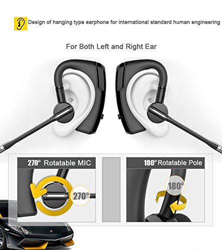 -. Feature : REMARKABLE SOUND QUALITY & CALL CLARITY Our Bluetooth 4.0 headphones with microphone use state-of-the-art echo elimination to make conversations sound like they're taking place face to face. Noise cancelling technology makes it easy to hear your favorite songs and the person you're speaking to. Plus, the A2DP profile provides HD sound quality / ENGINEERED FOR COMFORT Our Bluetooth earpieces were made to provide a perfect fit! You get two different earbuds to choose from to ensure that you're comfortable no matter how long you wear them. The receiver can be rotated up to 180 degrees, and the microphone rotates across 200 degrees for a truly custom fit. / CHAT & LISTEN FOR LONGER Our wireless earphone are powered by a powerful lithium ion battery for up to 8 hours of music, 9 hours of talk time and 220 hours of standby. You can recharge fully in just 2 hours to have the earphone headset ready for use again. / SO EASY TO CONTROL The intuitive design of our bluetooth headset/headphone makes it easy to control the volume, start and stop the music, answer calls and move between songs. You can leave your phone or tablet safely in your bag or on your desk! / SYNC WITH 2 DEVICES Pair our headphones with microphone and volume control with two different devices to listen to music on one and talk on the other, to answer calls on your work and home phones or to browse 2 different music libraries