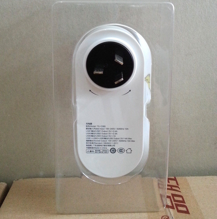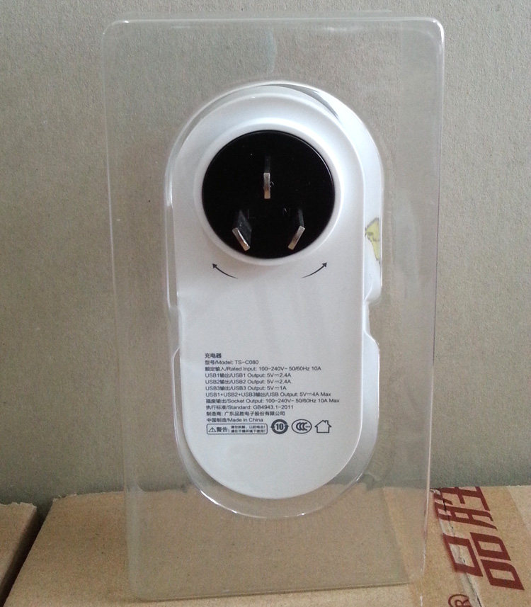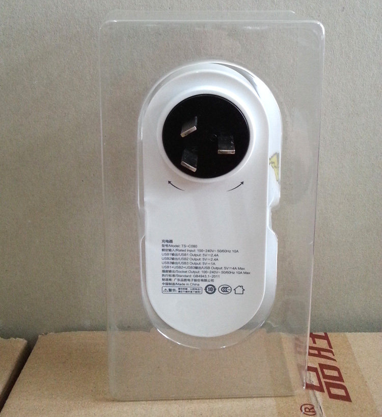 4USB version of the row of plug: (4 USB interface at the same time the maximum output total current 4A, the total power of 20W, a single USB charging four USB interface current were 1A, 1A, 2A, 2A, the bottom of the 2A interface for the smart Smart interface, if your phone or flat above the 2A interface charge is relatively slow, you can change the smart interface charge, more compatible)