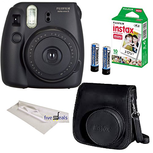 FujiFilm Black Instax Mini 8 Camera, 4 Piece Camera Bundle, Black Groovy Camera Case, 10 Sheets of Film, Microfiber Cloth Lenses Cleaner
