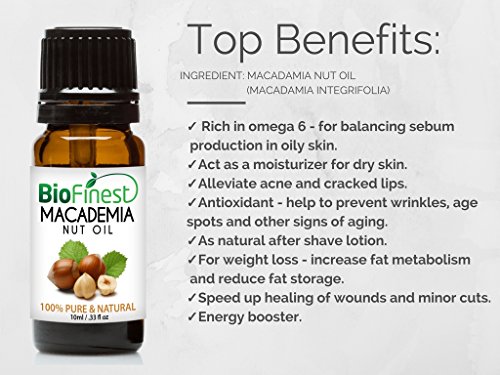 -. Feature : PREMIUM QUALITY MACADAMIA OIL: 100% Pure Cold Pressed, Natural, Organic, Non-Toxic, No Additives, Unfiltered, Undiluted with No Fillers. Vegan certified, paraben free, cruelty free. Safe for your family and children! / MOISTURIZER AND HEALS DRY SKIN FACE & HAIR - naturally freshens, hydrates and softens dry skin, it also repairs and beautifies hair, from roots to split-ends and improves scalp health. Best for aromatherapy to blend with your favourite essential oils! / RICH IN VITAMIN E, NATURAL FATTY ACIDS, MINERALS, OMEGA 6 - Natural prime antioxidant combating premature ageing skin, eczema, psoriasis and more. Quickly absorbs and deeply penetrates to heal, nourish and hydrate! / PACKAGED IN USA, ELEGANT AMBER BOTTLE: Comes with premium euro dropper cap for easy dispensing. No Leakage or Dripping. Perfect for gift, best value for your money! / 100% SATISFIED OF MONEY BACK: We are eco-friendly USA company who stand behind our brand. Try our products risk-free with 100% money back guarantee.