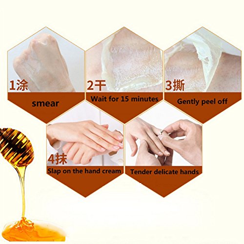-. Feature : Keep your hands translucent, bright, delicate, white, and absorb nutrients. / Natural honey wax repair, nourish with natural SPA level honey. Firm up hand skin and alleviate hand issues. / Each drop is milk essence, giving out refreshed scent. Milk contains rich nutrients, which can prevent cracks,resist wrinkles and keep skin smooth, soft and delicate. / Quick and convenient, One applying and one peeling off. Take two simple steps, and keep skin tender fashionably and conveniently. / Hands are different from face. Hands may contact chemical substances every day, especially the detergents. Besides, they also have to touch and labor, so hands should be cared and nourished.