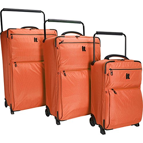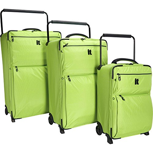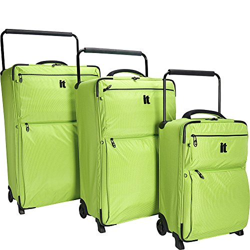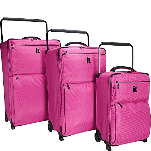 Studio : IT Luggage Publisher : IT Luggage Binding : Apparel Product Description This World's Lightest 3 piece set consists of bags made of ultra-strong fiber-glass structure and stylish two tone fabric.The cases have 2 smooth and silent wheels and a wide soft grip non-locking handle which allows for seamless manouverability while travelling. The top side handles helps lifting. The two outer pockets on each case provides useful extra packing space. The interior is fully lined and features 6 mesh slip pockets for keeping smaller items safe. The fully adjustable tie-down garment straps secure items in place. 10 year manufacturer warranty. 0