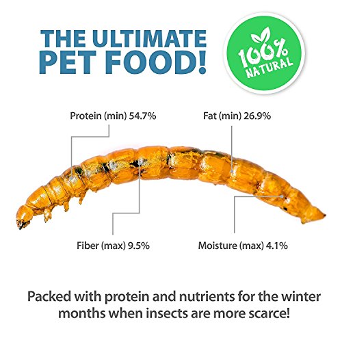 - HEALTHY & FRESH - Our dried mealworms come in a Resealable bag and contain all-natural high quality protein (54.7%), fat (26.9%), and fiber (9.5%) providing not only an incredibly tasty treat but also a nutritious balance you can trust.
