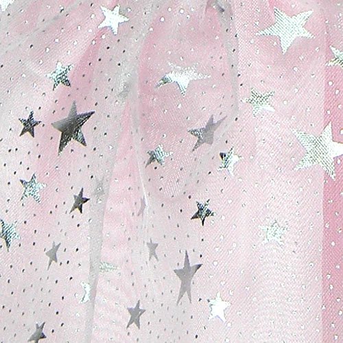 - Pretty pink satin dress with silver sequin trim. silver stars silk screened on a sheer organza overlay.