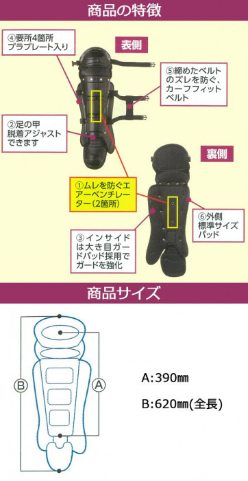 ムレを防ぐエアーベンチレーターや、締めたベルトのズレを防ぐカーフフィットベルトなど、様々な特長をもった球審用レガーズです。