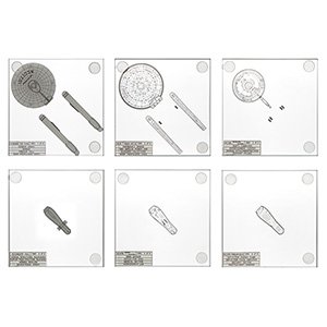-. Brand : ThinkGeek -. Color : Clear, Gray, Black -. EAN : 0847509022108 -. Feature : Officially-licensed Star Trek: The Original Series merchandise / Layered design on top and bottom of glass for a 12-layer effect / Materials: Glass with silicone feet / Care Instructions: Hand wash / Dimensions: 4" square x 1/4" thick each (stacks to 1 1/2" tall) -. ProductGroup : Kitchen -. ProductTypeName : KITCHEN -. Title : Star Trek U.S.S. Enterprise NCC-1701 Coasters Set of Six -. UPC : 847509022108