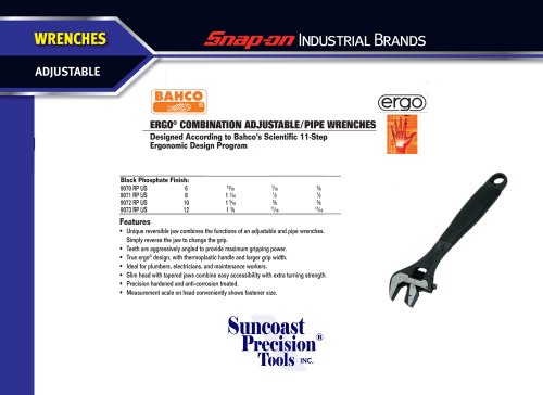 Studio : Bahco Publisher : Bahco Binding : Misc. Product Description True ergo® design, with thermoplastic handle and larger grip width. Ideal for plumbers, electricians, and maintenance workers. Slim head with tapered jaws combine easy accessibility with extra turning strength. Precision hardened and anti-corrosion treated. Measurement scale on head conveniently shows fastener size. 0