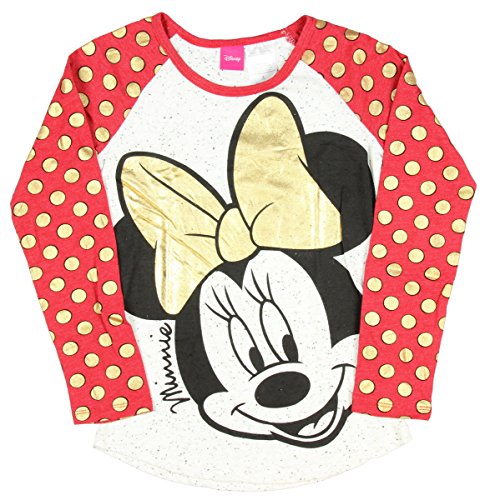 Minnie Mouse, Minnie to her friends, is the girlfriend of Mickey Mouse. She is known for her iconic ears, accented with a decorative bow and infectious happy attitude and bright smile. This shirt features Minnie with a gold foil hair bow on a speckled raglan tee. the contrasting red sleeves feature gold foil polka dots. Made of 60% cotton/40% polyester.Feature