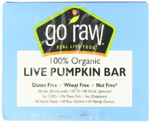 -. Binding : Grocery -. Brand : Go Raw -. EAN : 0859888000530 -. Feature : Real Live Foods 100% Organic USDA Organic / Raw Vegan Certified Organic Certified Wheat/Gluten Free / Nut Free* Kosher 320 mg Omega-3 350 mg Omega-6 / High in Fiber Certified Organic by Organic Certifiers -. Label : Go Raw -. Manufacturer : Go Raw -. NumberOfItems : 10 -. PackageQuantity : 10 -. ProductGroup : Grocery -. ProductTypeName : GROCERY -. PublicationDate : 2011-04-30 -. Publisher : Go Raw -. Studio : Go Raw -. Title : Go Raw Live Pumpkin Bar, 10 - 13 gram Bars -. UPC : 859888000646