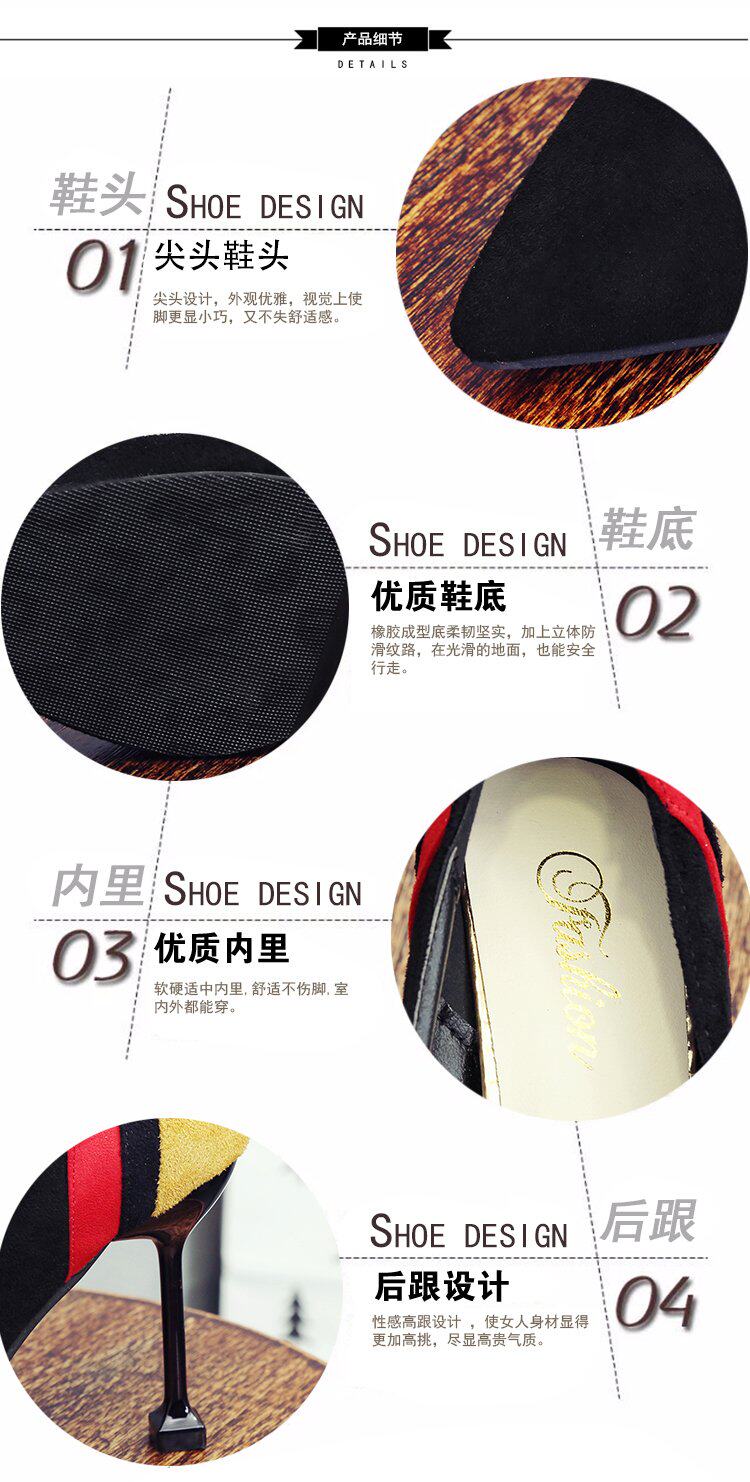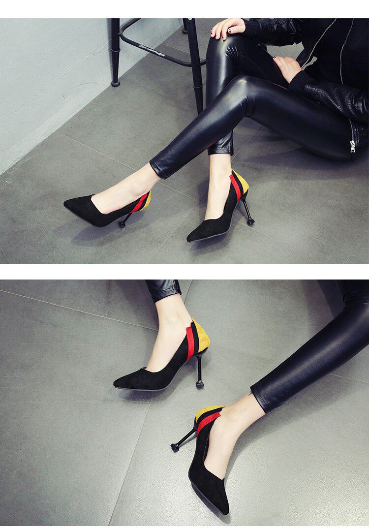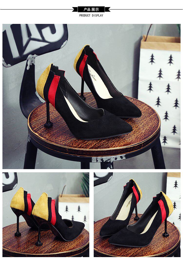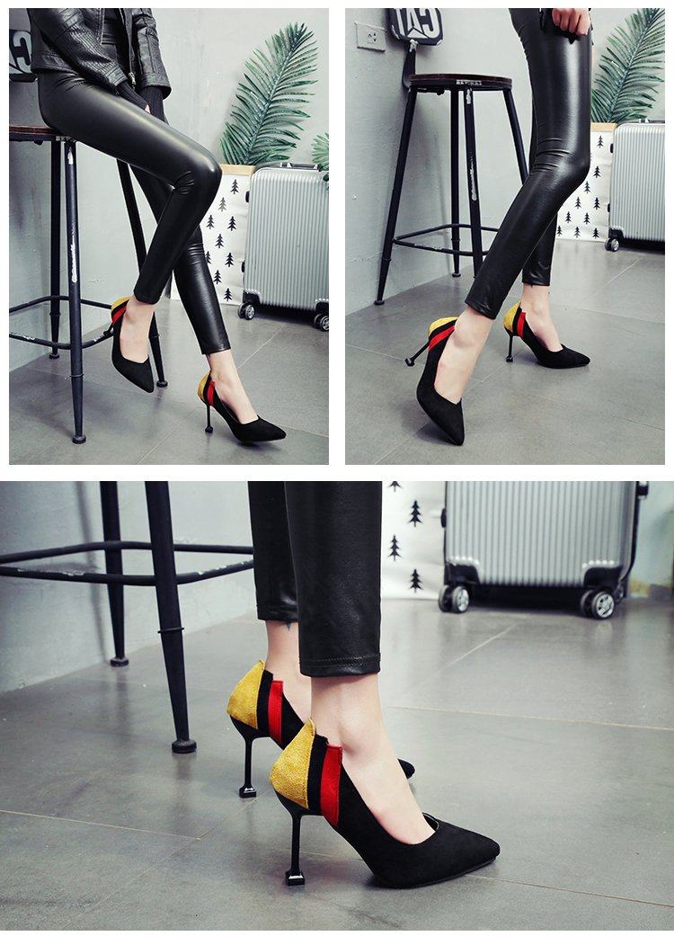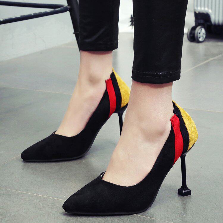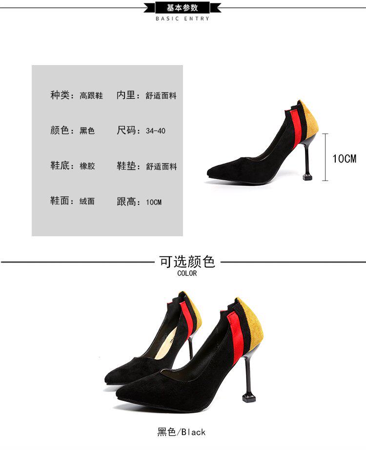 欧美拼色绒面显瘦单鞋春季新款细跟高跟鞋时尚尖头浅口女鞋