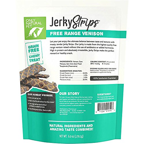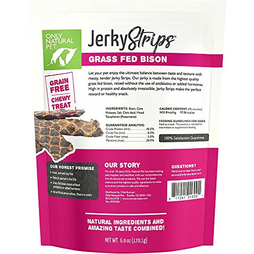 -. Feature : MADE IN THE USA from the highest quality novel proteins raised without added hormones or antibiotics, like grass fed bison and free range venison. / REAL MEAT TREATS give your dog a delicious meat taste and hearty, chewy texture that offers a satisfying snack or can be broken into pieces for a high reward training treat. / GRAIN FREE & ALL-NATURAL jerky strips are healthy for your dog and contain only natural ingredients - no artificial colors, flavors or preservatives. / ALLERGY FRIENDLY novel proteins make these delightfuly delicious treats ideal for dogs that have food sensitivities, especially to common ingredients like chicken, beef and grains. / SATISFACTION GUARANTEE - Only Natural Pet products always include a 100% Satisfaction Guarantee. Only Natural Pet uses only the highest quality ingredients in our recipes. Providing you & your pet the highest quality products is our top P.R.Iority.