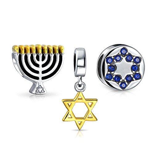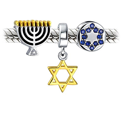 Celebrate the festival of lights with a new holiday bead set and liven up any Pandora compatible beads bracelet. With three Chanukah charms to help depict the holiday, this trio will add just the right touch to her beads bracelet. Jewish jewelry makes a great gift and the simulated blue Topaz CZ accents makes this a cute September birthstone gift.