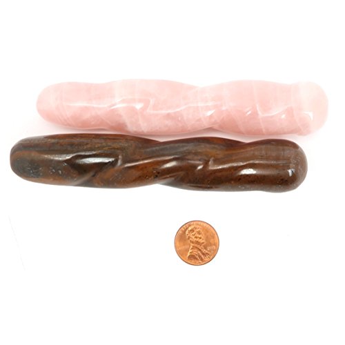 Mineral Facts: Natural Rose Quartz and Tigers Eye are carved into your new wand set. The Rose Quartz is a translucent pink stone with white inclusions and the Tigers Eye is a golden brown banded stone. The natural stones are polished into smooth twisted massage wands.