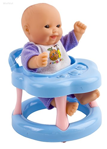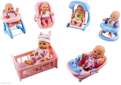 -. Title : WolVol Set of 6 Mini Dolls with Cradle, High Chair, Walker, Swing, Bathtub, Infant seat