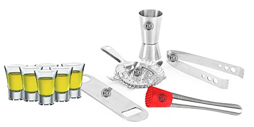 -. Binding : Kitchen -. Brand : King International -. Color : . -. Feature : Bar Set | Bar Tools | Bar Accessories Set Of 11 Pieces Includes 6 Shot Glasses | Muddler | Bottle Opener | Tong |Peg Measurer | Bar Strainer / Wine Glasses 8x8x9 cm| Tong 2 X 12 X 3 cm | Peg Measurer - 4.4 X 4.4 X 9 cm | Bar Strainer 15 cm X 8 cm X 2 cm| Muddler : 1.2 x 1.2 x 8 inches|Bottle Opener 10 x 3 x0.5 cm / IDEAL FOR ANY LEVEL - If you're looking to mix up delicious and refreshing cocktails that you'll want to serve again and again at your next cocktail party | then this is the set you'll need. It's durable | rugged | washable and great to train the beginner bartender | as well as to be enjoyed by the pro's. Recommended for anyone who wants to start a home bar | or add class and variety to an existing one. / A TASTE FOR ALL - Experiment with the classic cocktails such as the minty | zesty mojito | an easy vodka tonic | or an exotic honey and bergamot-flavoured Golden Flip. Stick with a delicious vodka cocktail | or branch out with some non-alcoholic Mocktails. Select something that fits your mood | or pick something and adventurous. Either way you can't go wrong! / GET INTO THE MIX - Impress friends and colleagues with this upscale | fabulously priced King International Bar Set | perfect for a cocktail party | cocktails gift | home bars | professional bartenders | a birthday present or and exciting hobby. -. Label : King International -. Manufacturer : King International -. Model : KI-SS-FGH-GGFG-200 -. MPN : KI-SS-FGH-GGFG-200 -. PartNumber : KI-SS-FGH-GGFG-200 -. ProductGroup : Kitchen -. ProductTypeName : HOME -. Publisher : King International -. Size : . -. Studio : King International -. Title : King International 100% Stainless Steel Bar Set | Bar Tools | Bar Accessories Set Of 11 Pieces Includes 6 Shot Glasses | Muddler | Bottle Opener | Tong |Peg Measurer | Bar Strainer