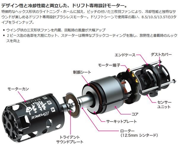 特徴的なヘックス形状のライトニング・ホールに加え ピッチの付いた三枚羽ファンにより 冷却性能と独特なサウンドが楽しめるドリフト専用設計ブラシレスモーターです