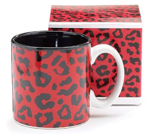 -. Feature : Design: Red mug with black leopard print pattern, black interior, and white handle / Size: 4 1/4"H X 5"W X 4"D. Holds 13 oz. / Material: Ceramic / Microwave/Dishwasher safe, FDA Approved