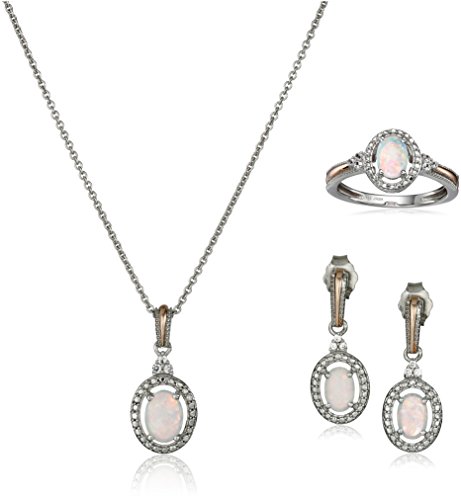 -. Binding : Jewelry -. Brand : Amazon Collection -. Color : White -. Department : womens -. Feature : Three-piece pendant necklace, earrings, and ring set each featuring simulated opal in four-prong setting with halo of created-white sapphires / Imported -. Label : Amazon Collection -. Manufacturer : Amazon Collection -. Model : 474836/STGSIL/P/YY/M305/SIL030RLO/STD -. MPN : 474836/STGSIL/P/YY/M305/SIL030RLO/STD -. PackageQuantity : 1 -. PartNumber : 474836/STGSIL/P/YY/M305/SIL030RLO/STD -. ProductGroup : Jewelry -. ProductTypeName : FINEOTHER -. Publisher : Amazon Collection -. Studio : Amazon Collection -. Title : 14K Rose Gold over Sterling Silver Created Opal with Created White Sapphire Pendant Necklace, Earrings and Ring Box Set
