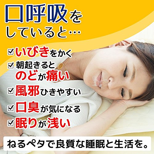 "Rough hard to adopt a friendly adhesive to the skin. "Peeling hardly feel it does Mase stuffiness over longer periods of time because there is a soft ♪ ventilation hole. In addition, inconspicuous also stuck because it is clear type! Staying and travel, you can use without worrying about even in such as sleep on the move! Children as well as adults we can use it. It is mouth closed tape encourage nose breathing. Reduce or bad breath of snoring, cold prevention and more! Body size: W32mmxH50mm number of sheets: 1 sheet (two) x15 sheet (30 sheets) Material: polyethylene originally not in the (ventilation machined) ※ medical equipment, our bodies are designed to make breathing through the nose modern more than half of Japanese have a mouth breathing. Mouth is in for a meal and conversation, not the place suck the air. It will adversely affect the mouth breathing cause. Total wager even one any of the following may you also have unconsciously mouth breathing? - or snoring during sleep, resulting in the bruxism. · Morning happens when the throat is sore and dry, catch a cold easily, bad breath and tooth decay, periodontal disease is fatigue because of the shallow-sleep anxious can not be recovered. Resulting in a doze. Total wager even one be you also have a mouth breathing? "Mouth breathing prevention tape of the special structure to firmly support the nose breathing. "A closed mouth with a cross-like shape and keep until morning. Firmly fit on the lips because it uses a soft material that effective against stretch! Paste easy Pitatto a thin, less discomfort even after the stretched tension comfort ◎! Smell do not mind! Since that stick to the bottom of the nose will interfere with sleep in the mood to have a strong smell. Neru you can sleep because Peta is not worried less smell. [From the mouth and breathing healthy sleep by changing to nose breathing life! ] Do not start sleep and comfortable life in the nose breathing tape you also sleeping capitalists to promote nose breathing? Important to characterize nose breathing habits. It sticks habit of nose breathing to sleep continue to paste the about three weeks capitalists. (There are individual differences ※.) The first time because it contains 30 times and about one month worth of sleeping capitalists who are Let's try First one month! Initially, there is a sense of incongruity, but you gradually get used. Neru time you do not want to use the capitalists to make sure you never miss another aware of the nose breathing! unisex! It is mouth closed tape encourage nose breathing. Reduce or bad breath of snoring, cold prevention and more! Body size: W32mmxH50mm number of sheets: 1 sheet (two) x15 sheet (30 sheets) Material: polyethylene (already ventilation processing) ※ It is not a medical device