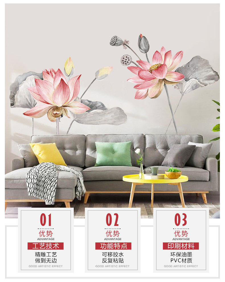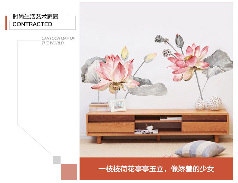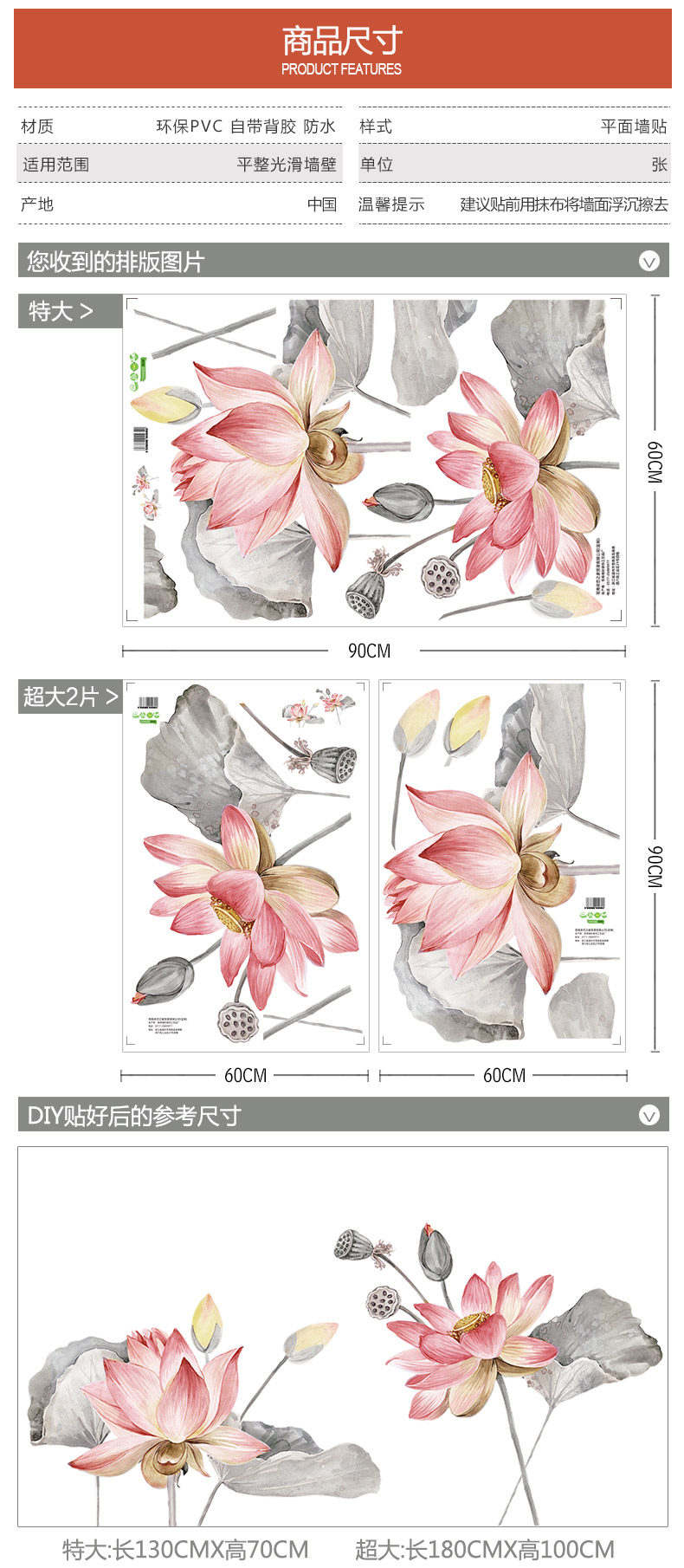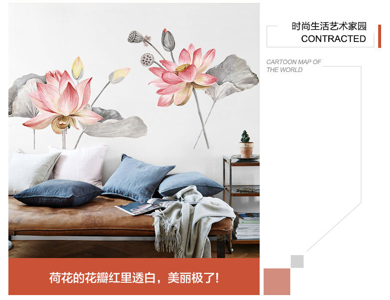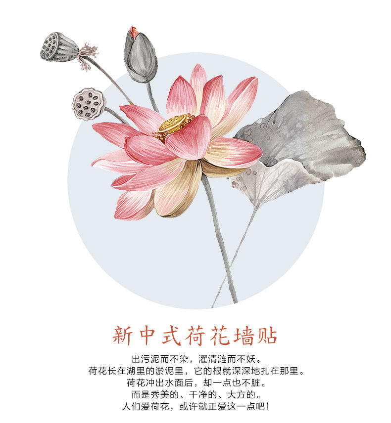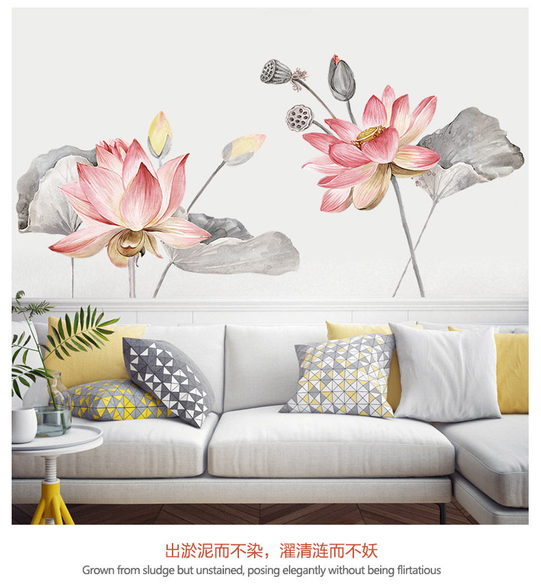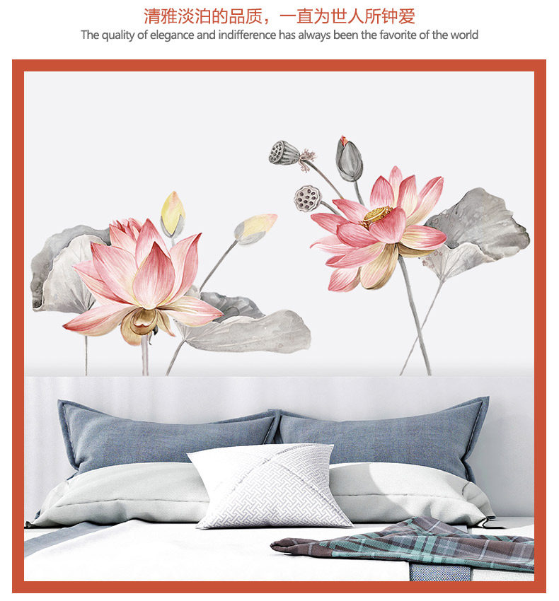 中国风荷花墙贴客厅墙面装饰品卧室贴纸防水墙纸温馨自粘壁纸贴画