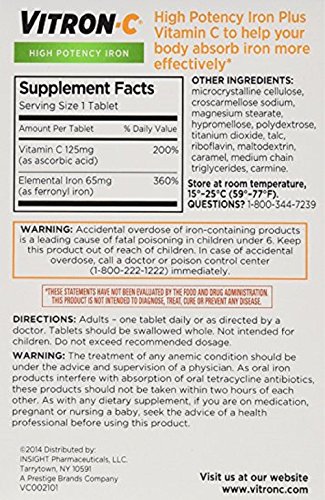 -. Binding : Health and Beauty -. Brand : Vitron-C -. EAN : 0363736123017 -. Feature : Vitron-C is a high potency iron dietary supplement. Its unique formula provides elemental iron to restore your iron reserves, plus vitamin c to help your body absorb the iron / A once a day tablet that helps your body absorb dietary iron more effectively / Easy on the stomach and less constipation / 65 mg elemental iron / Iron supplement with vitamin c only one tablet per day -. Label : Vitron-C -. Manufacturer : Vitron-C -. PackageQuantity : 1 -. ProductGroup : Pantry -. ProductTypeName : HEALTH_PERSONAL_CARE -. Publisher : Vitron-C -. Studio : Vitron-C -. Title : Vitron-C High Potency Iron Supplement with Vitamin C, 60 Count -. UPC : 363736123017