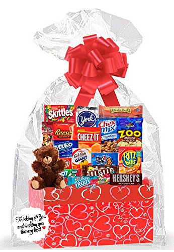 -. Feature : Beautifully packed for an amazing thinking of you presentation. / Gift Basket Includes: Skittles 2.17oz,Froot Roll .75oz, Chex Mex 1.75oz, Reeses 1.5oz, Nature Valley Peanut Bar 1.49oz, Cheez-it 1.5oz, Gushers 0.9oz, KitKat 1.5oz,Chips OHoy 1.4oz, Ritz Bites 1.0oz, Hersheys 1.55oz, Mini Oero 1.0oz, York Pattie .48oz, Trail Mix 1.5oz, Rice Kripsy Treats 1.3oz, Zoo Animal Cookies 1.0oz, GoldFish .75oz Stunning package sure to put a smile on the face of the recepient. Packed in a gift box as shown with an 8inch Plush. Finished with a stunning bow!