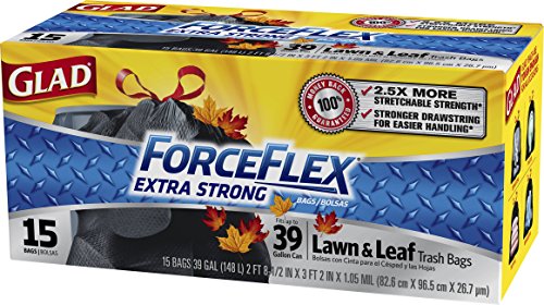-. Title : Glad ForceFlex Extra Strong Lawn and Leaf Drawstring Trash Bags, 39 Gallon, 15 Count (Pack of 6) (Packaging may vary)