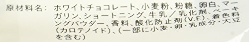 原材料:砂糖、小麦粉、マーガリン、卵白、ショートニング、全粉乳、ココアバター、生クリーム、植物油脂、乳糖、食塩、乳化剤(大豆由来)、香料、着色料(クチナシ、紅花黄)、膨張剤、ハッカ油
