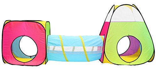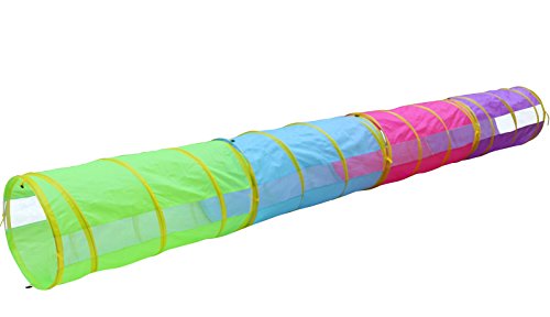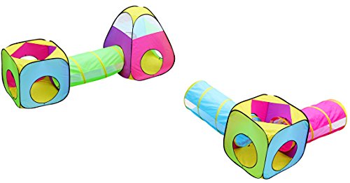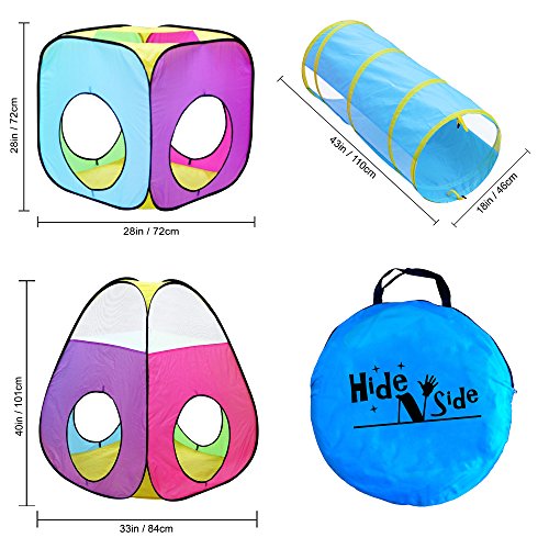 Hide-n-Side Tents and Tunnels are the perfect place to practice crawling, sensory processing and coordination activities. Also, a great place to just hang out! These vibrantly-colored, friendly-faced play house and tunnels make a lovely, bright and inviting place for kids to play. Children love to explore, play pretend inside and even to use them as a refuge from the light, noise and hustle of a busy home or classroom. Our tunnels are amply-sized so that even larger children can fit in comfortably, but they store compactly and conveniently in the accompanying bag, making them suitable for small homes, apartments or daycares. Collapses for easy storage with securing twist locks. Made from polyester with a wrapped steel spring frame sewn safely and securely into a fabric sleeve. These crawling tents and tunnels are designed for years of play! $120 VALUE!!! 1 x Triangular Play Tent: 40" Height - 46" Diagonal Base Width - $25 VALUE! 2 x Square Play Tents: 28" Height - 40" Diagonal Base Width - $20 VALUE EACH = $40 VALUE! 3 x Tunnels: 43" Length - 18" Diameter - $15 VALUE EACH = $45 VALUE! 1 x Lightweight, Compact Zipper Carrying Case - 21" Width/Length - $10 VALUE!Feature