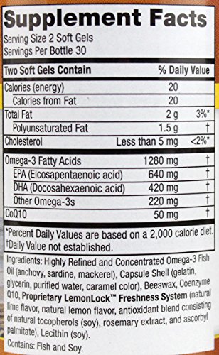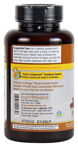 -. Binding : Health and Beauty -. Brand : Purity Products -. EAN : 0184392000326 -. Feature : Supports Normal Cardiovascular & Arterial Health* / Promotes Healthy Brain Function* / Supports Beautiful Healthy Skin* / Molecularly distilled Omega-3 Fish Oil along with the advanced health-supporting power of CoQ10. / LemonLock Freshness System locks in purity and seals in freshness. -. IsAdultProduct : 0 -. Label : Purity Products -. LegalDisclaimer : *These statements have not been evaluated by the Food and Drug Administration. These products are not intended to diagnose, treat, cure or prevent any disease. -. Manufacturer : Purity Products -. MPN : 1123 -. PackageQuantity : 1 -. PartNumber : 1123 -. ProductGroup : Health and Beauty -. ProductTypeName : HEALTH_PERSONAL_CARE -. Publisher : Purity Products -. Studio : Purity Products -. Title : Co-Q-Omega: CoQ10 and Omega-3 Fish Oil Formula 60 Soft Gels from Purity Products -. UPC : 794168682252