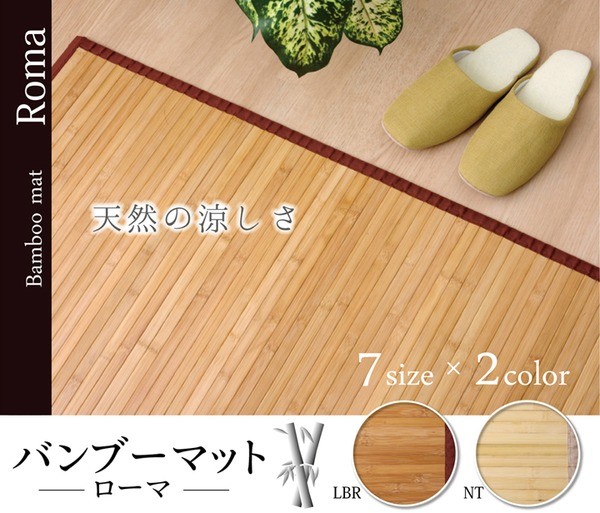 【商品名】 バンブー 竹 廊下敷き フロアマット 『ローマ』 ライトブラウン 80×240cm 【ジャンル・特徴】 汚れにくく耐久性に優れたひんやり竹ラグマット バンブーマット ■サイズ・色違い・関連商品関連商品の検索結果一覧はこちら 孟宗竹の表面付近の目がぎっしり詰まった部分のみを使用した竹ラグです。表面部分は特に汚れにくく耐久性に優れ、熱伝導率が高いため、ひんやり感も抜群です。表面の肌触りを滑らかにするため、また竹の色を揃えるためにUV塗装を施しています。また無垢材を使用し、あたたかみのある質感に仕上げました。スモークすることで色を出しています。染料、顔料は使用していません。シンプルな糸無しの張り付けタイプです。素材は皮下17mm幅の竹ヒゴを使用しています。17mmの竹ヒゴは大きく育った竹からしか取れない素材です。竹は他の木材と比べると格段に成長が早く(3~5年で成竹)、持続的生産が可能な環境に優しいサスティナブルな素材です。■商品スペック【サイズ】80×240cm【原産国】:中国製【素材】:表地=竹 裏地=不織布 ヘリ=PP【特記事項】画像のカラー・サイズ・セット内容とは異なる