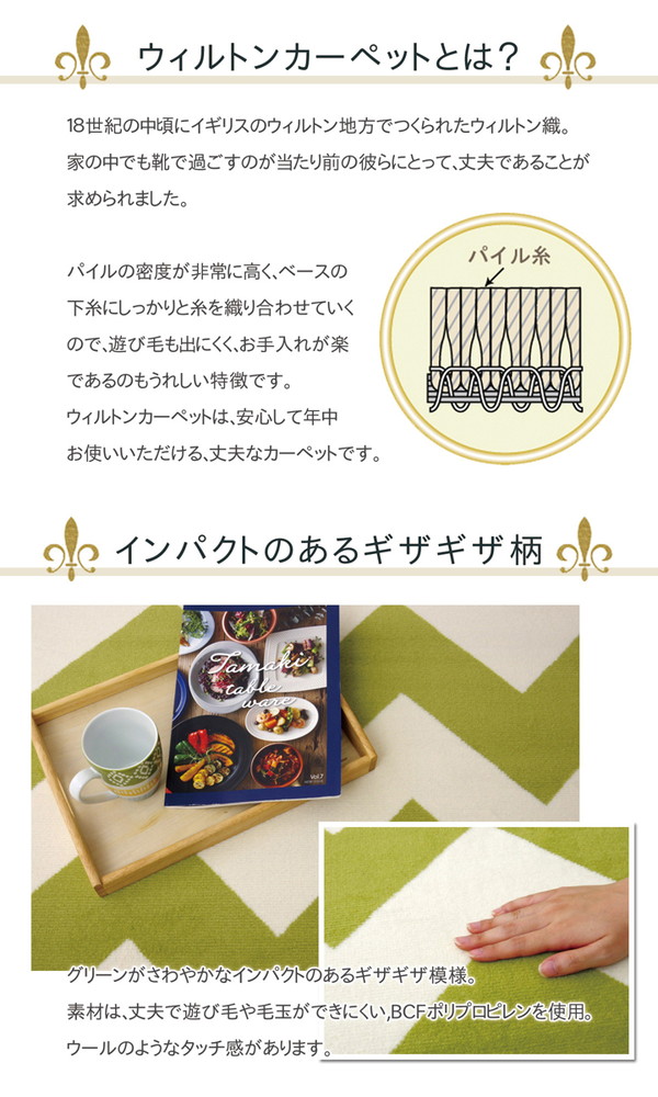 通常商品本場ベルギー製のウィルトン織りカーペットです。お求めやすい価格の商品です。お部屋に敷きやすい幾何柄にしました。素朴な雰囲気はどんなお部屋にもマッチします。本商品のパイル部分にはBCFポリプロピレン素材を使用しており、ウールのような素材感があります。ポリプロピレンはヘタリにくく、耐久性に優れ、繊維の中でも軽い素材です。また、汚れが付着しにくく、遊び毛や毛玉が非常に出にくいという特徴もあります。ホットカーペットカバーや床暖房にも対応しております。安心して年間お使い頂けるカーペットです。