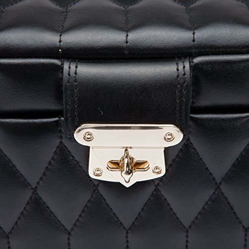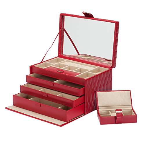 -. Feature : Dimensions: 13W x 8.5D x 8.25H in. / Quilted leather in your choice of available color options / Glass mirror, 19 compartments, 4 ring rolls, travel case / LusterLoc lining prevents tarnishing / Gold-finished lock