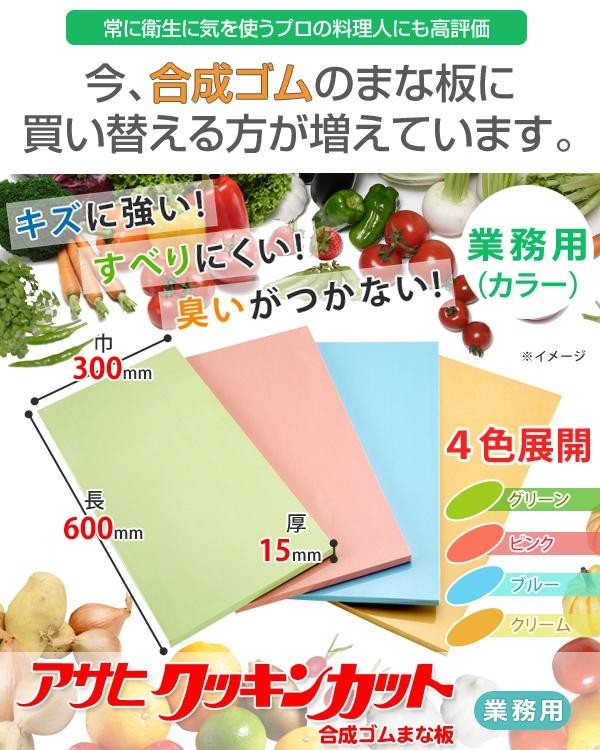 合成ゴムまな板は木肌に近い感触と、従来品にない清潔さを合わせもつまな板です。合成ゴムを素材としているので、吸水性がなくて水切れがよく、汚れがつきにくいので雑菌の繁殖を防ぎます。また水洗いの後、ふきんで軽く拭くだけで水が切れるので、手入れもとても簡単です。4色のカラー展開で魚介類や野菜類など使い分けに便利です。 |