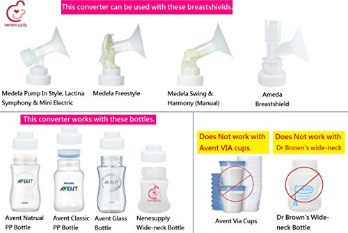"Do you use Medela or Ameda breastpumps but feed your baby with Avent or other wide-neck bottles? With this product, you can pump directly into Avent bottles and Nenesupply wide-neck bottles without transfering milk from standard bottles. This product contains 2 breastpump converters and 6 wide-neck bottles. The converters adapt Medela or Ameda breastpumps to fit with wide-neck bottles. It can be used with Medela Mini Electric, Harmony, Pump-In-Style, Swing, Freestyle, Lactina, Symphony, Ameda Purely Yours, Ameda Elite Breastpumps. You can pump directly into Avent Classic bottles, Avent Natural PP bottles, Avent Glass bottles, and Nenesupply wide-neck bottles. Every converter has embeded leak-proof design. Also include sealing rings. You can use it on all the above breastpumps without leaking problems. Note: This converter does not work with Avent VIA cups."Feature