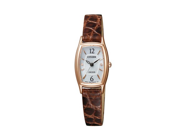 エコドライブ、±15秒/月、光発電約7カ月、5気圧防水、カラー:ピンクゴールド(本体)、シルバー(文字盤)、ブラウン(ベルト)