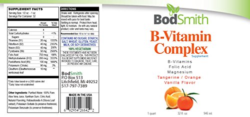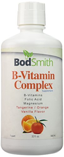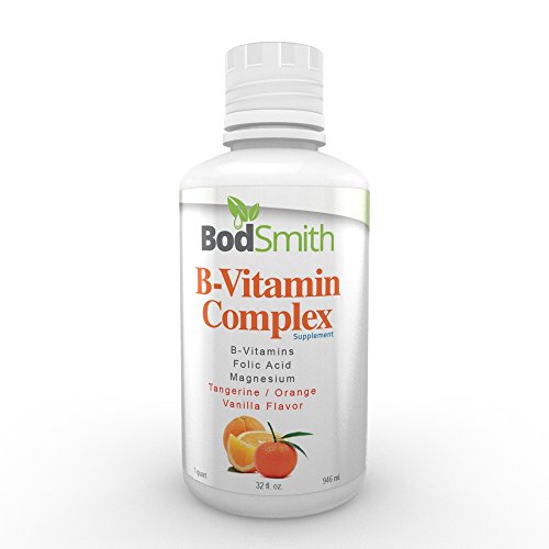 -. Feature : The number one health complaint in America is the lack of energy. This B-Vitamin Complex vitamin provides a natural energy boost without stimulants or resulting in a caffeine crash. Recent studies have also sested that B-vitamins can improve cardiovascular health. B-vitamins are vital for the nervous system by helping the body rebound and deal with stress more efficiently, and in energy production by assisting in the conversion of food to energy / This supplement is 100% Vegetarian Tangerine-Orange flavor / 100% NO RISK SATISFACTION GUARANTEED! We STAND behind our PRODUCT! If you are not satisfied for any reason you can return it within 30 days for a replacement or a FULL REFUND with no questions asked! / Your body absorbs liquid vitamins better than its pill counterparts do. In fact, the body absorbs up to 98 percent of the vitamins and minerals contained in liquid form. However, the body only absorbs anywhere from 3 to 20 percent of the vitamins in a vitamin pill. BodSmith focuses on creating premium formulas with select ingredients. These premium products and formulas are specifically designed for maximum potency, safety, and effectiveness. We P.R.Ide ourselves on the fact that we use the purest, highest quality, most natural nutrients available to produce all of our formulas. Our nutritional research focuses on the complex relationships that exist among available nutrients. / B vitamins function as cofactors for enzymes essential to healthy cell function and energy production* Supports healthy nervous system* Vitamin B1 (thiamin) supports proper functioning of the nervous system* - Vitamin B2 (riboflavin) and vitamin B5 (pantothenic acid) support healthy metabolism* - Vitamin B3 (niacin) supports the proper functioning of skin an nerves, and it aids in digestion* Vitamin B6 is involved in protein and red blood cell metabolism, and it supports the function of the nervous and immune systems* - Vitamin B12 works with antioxidant vitamins to minimize damage to body cell walls, and it helps to maintain healthy nerve cells* - Folic acid helps keep homocysteine levels within the normal range, as research shows that too much homocysteine in the blood may be detrimental to good health*