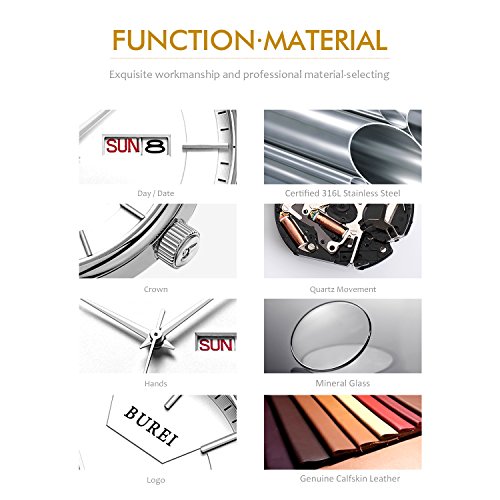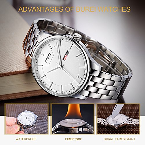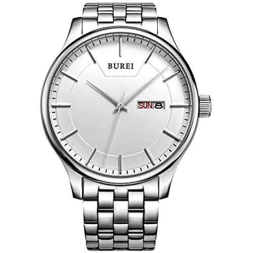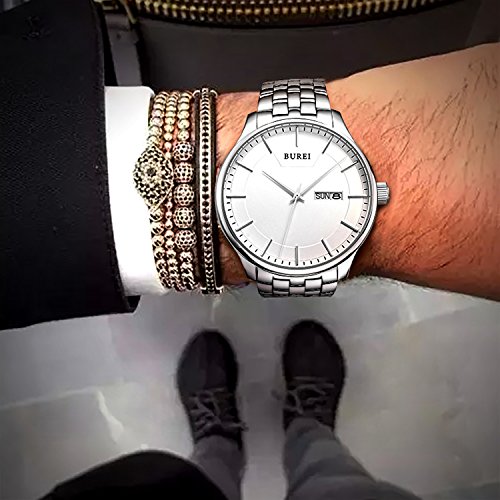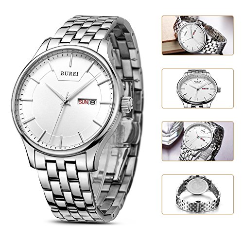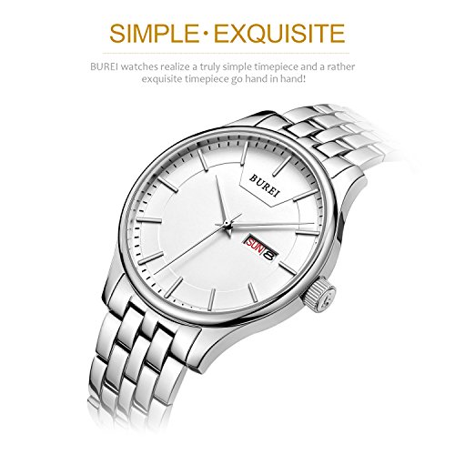 (《바오쇼》)BUREI 손목시계 맨즈 심플 쿼츠 아날로그 표시 실버 문자판 스테인레스 벨트 날짜,요일 표시 신사 손목시계