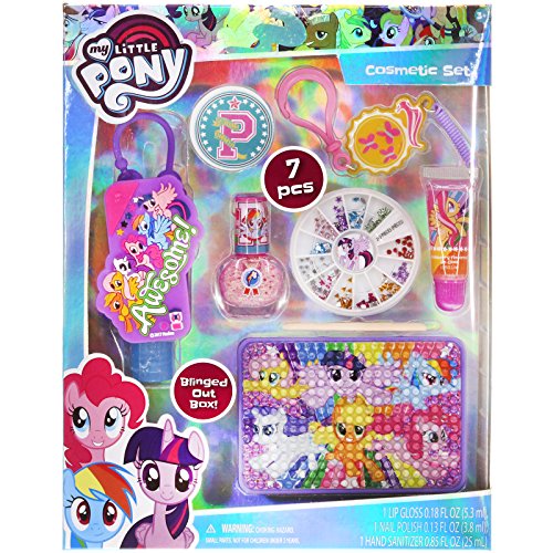 -. Feature : SPARKLE AND SHINE with this amazing cosmetic kit. Your little girl will love to play spa day, and express her creativity with all the sparkly, shiny makeup included in this beauty set. Blinged out box keeps everything together. / FABULOUS LIPS No more dry lips; protect, moisturize and revitalize lips with a sparkly, glittery gloss. / BRUSH ON, QUICK DRY makes these polishes perfect for small hands and feet. Remover not needed. No need to expose your child to harmful vapors and chemicals. Simply peel off dried polish to remove it from nails. / SAFE FOR GIRLS 6 YEARS OLD AND OLDER Non-toxic and water-based formula makes these cosmetics safe for your young ones aged six years old and older. From tween to teens, everyone will love this amazing set! / SET INCLUDES Nail polish, lip gloss, hand sanitizer, nail gems, cuticle stick and bling-covered box decorated with everyone's favorite My Little Pony characters.