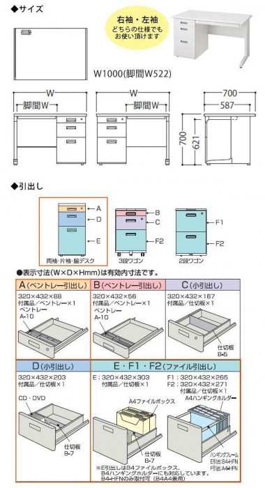 | 素材・材質 | 天板:スチール、メラミン化粧板 本体・脚:スチール(粉体塗装) 袖箱:スチール(粉体塗装) |
